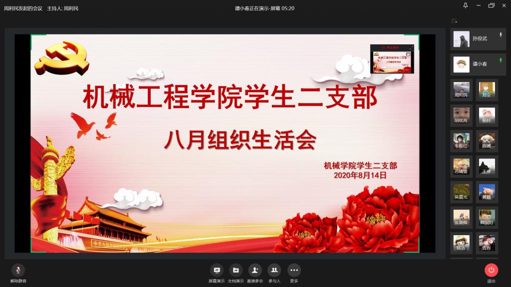 夏日炎炎,线上组织生活会犹如一杯凉茶,给同志们带来消暑的效果,在浮躁中静下来学习。8月14日上午10:30,8858cc永利官网学生二支部通过企业微信会议模式开展了八月组织生活会,会议由支部书记周利民主持,支部全体党员参加。